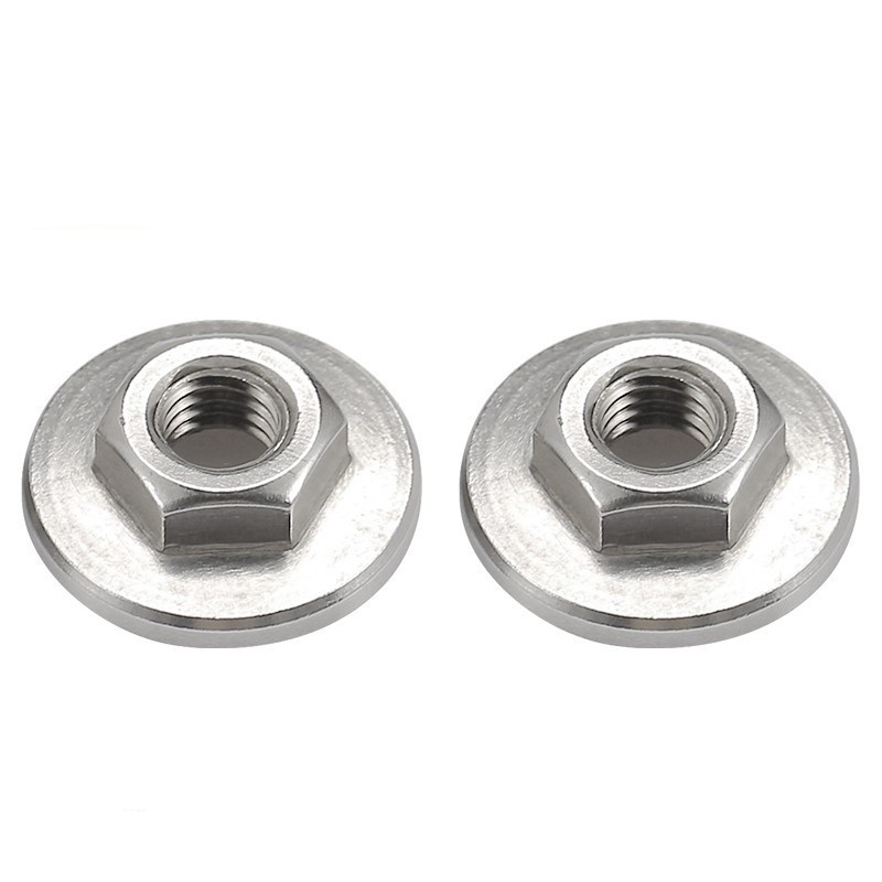 Denne møtriks mest markante del er den indbyggede flange - det er en bredere, flad ring forbundet til hovedmøtrikken. Flangen fungerer som en indbygget skive, så du behøver ikke tilføje en separat. Hoveddelen er cylindrisk med standard indvendigt gevind, der matcher metriske eller imperiale bolte.
