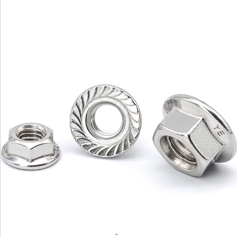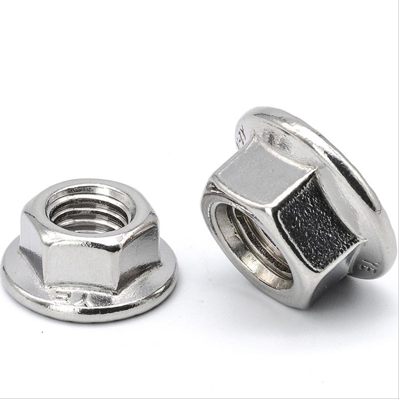 Hex flangemøtrikkerer seks-sidede nødder med en indbygget flange (bred, flad kant) i bunden. Flangen fungerer som en pakning, idet den beskytter overfladen ved at sprede trykket og samtidig reducere løshed forårsaget af vibrationer. Det er lavet af stål, rustfrit stål eller overtrukne legeringer og bruges i maskiner, køretøjer eller udendørs udstyr, hvor bolte vender mod vibrerende eller ujævne overflader. Kunder behøver ikke at bruge separate pakninger.